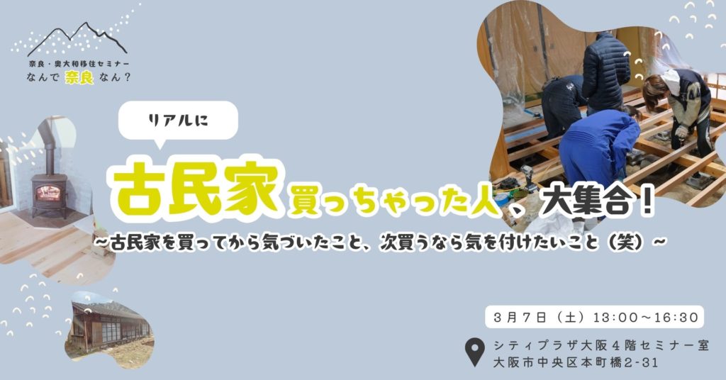 奈良・奥大和移住セミナー【なんで奈良なん?】リアルに古民家買っちゃった人、大集合!~古民家を買ってから気づいたこと、次買うなら気を付けたいこと(笑)~|3月7日