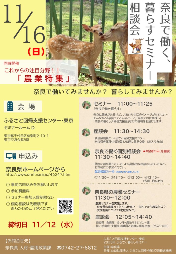 2025年11月16日(日)、奈良県内で働くことに関心のある方、暮らしてみたいと思っている方を対象にセミナー・相談会を東京で開催!