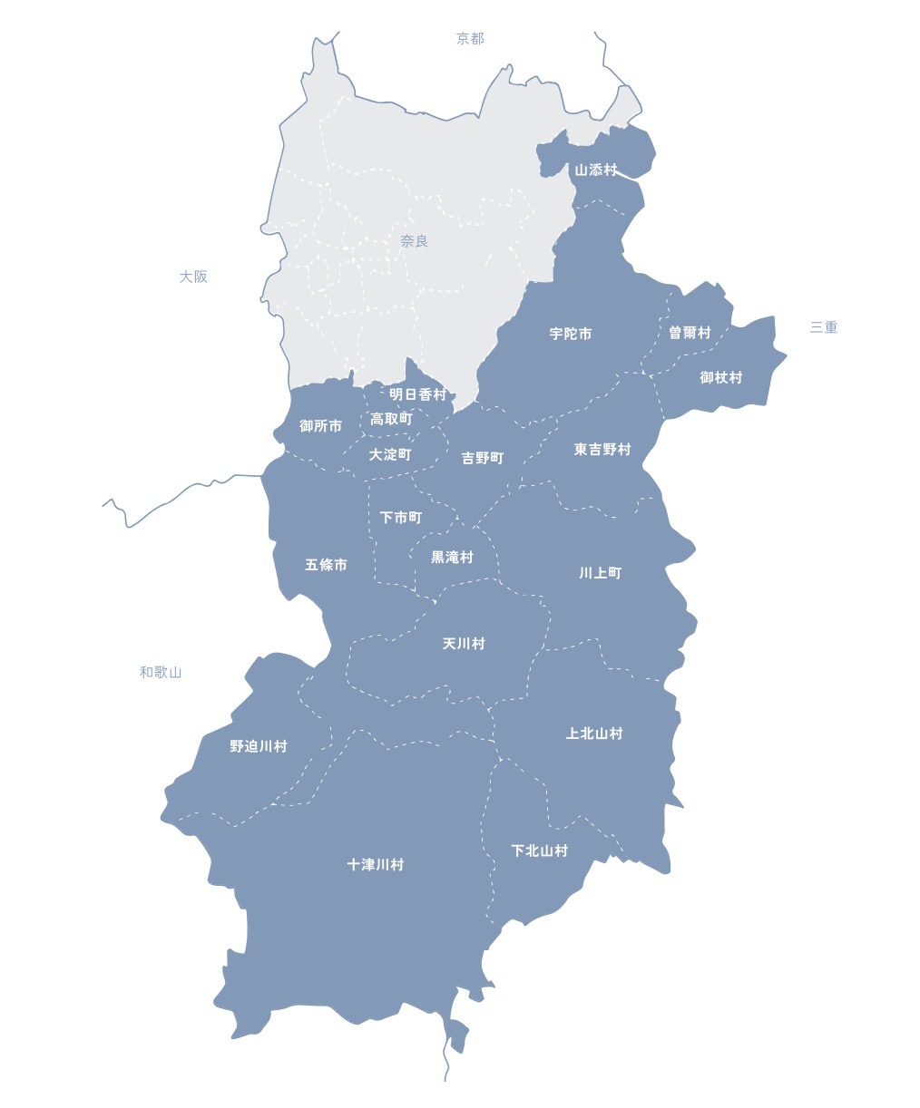 奈良県の南部・東部の19市町村を指します。この地域は、山岳地帯の南部、中南部は比較的平坦な地形が広がり、東部は高原地帯から構成され、町や集落が広い範囲に分布しています。人々は今でも、各地域で培われた深い歴史や文化、信仰そして自然とともに生活を営んでいます。